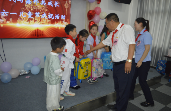 公司董事長為表演節(jié)目的小朋友頒發(fā)了獎品,同時給公司員工子女頒發(fā)了六一禮物。