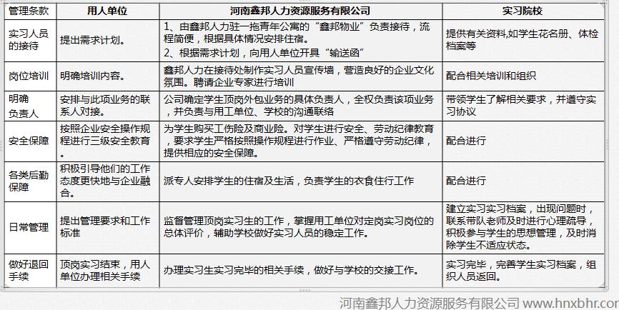 河南鑫邦人力資源服務有限公司是經(jīng)河南省人事廳、省勞動廳批準成立,并頒發(fā)有《勞務派遣許可證》、《人力資源服務許可證》的具有獨立法人資格的派遣服務機構,是河南省內人才派遣業(yè)內的聯(lián)盟企業(yè),是洛陽市政府大學生就業(yè)見習單位。公司認真執(zhí)行《洛陽市高校畢業(yè)生就業(yè)見習管理辦法》,依托鑫邦人力培訓平臺,加強對見習生的培訓、培養(yǎng)、指導、考核,協(xié)助發(fā)放《洛陽市高校畢業(yè)生就業(yè)見習證明》。